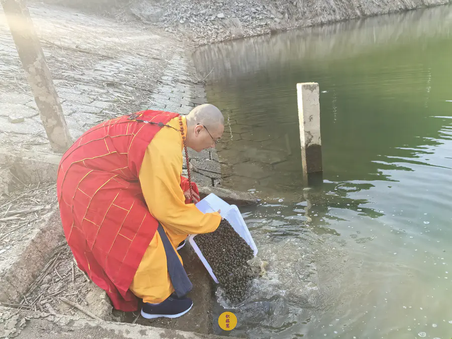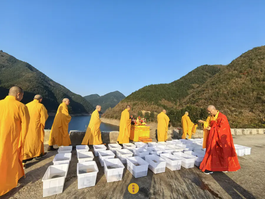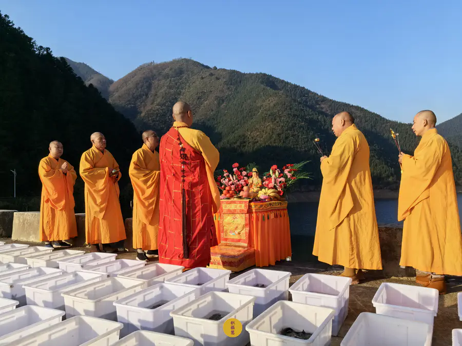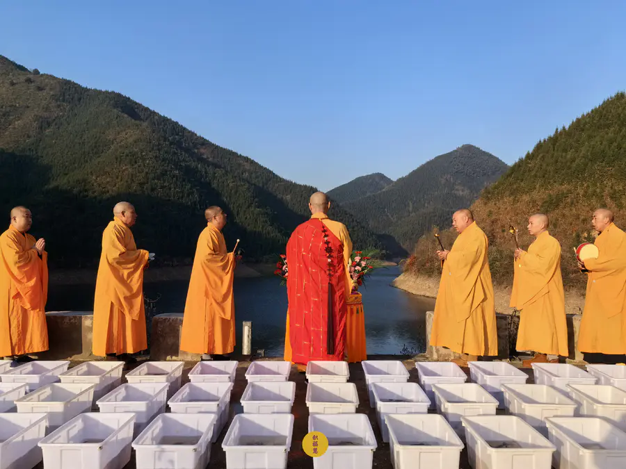 法师以大悲净水,为水族生灵遍洒甘露,祈愿众等,早闻佛法,开智增慧。