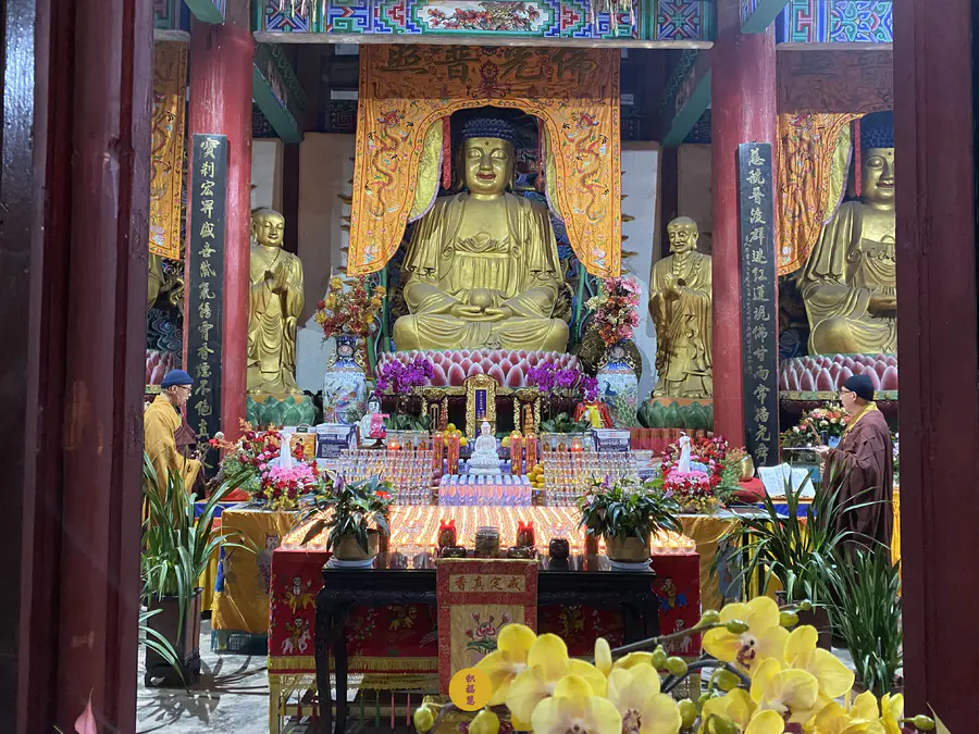曲靖安国寺下元节供灯祈福法会开始。法师与信众威仪齐整,梵呗清扬。
