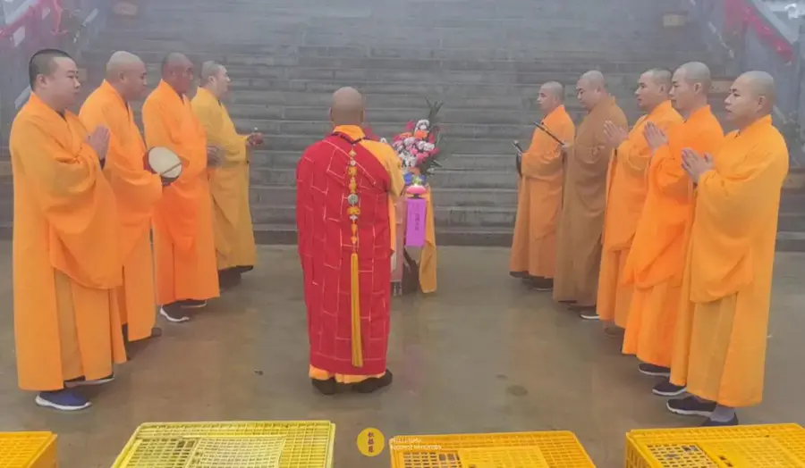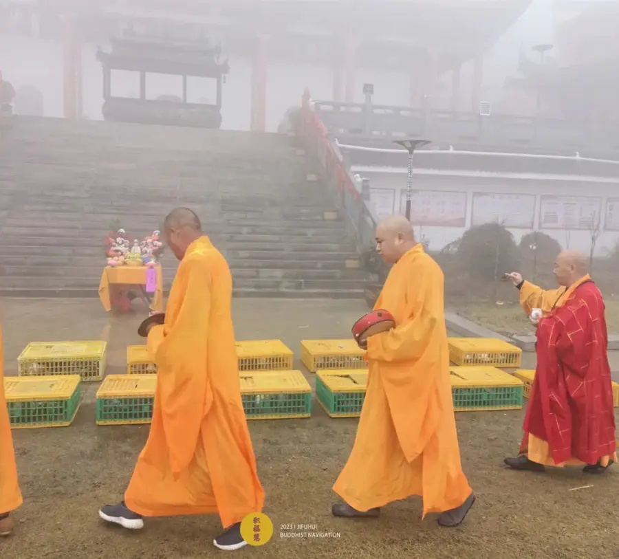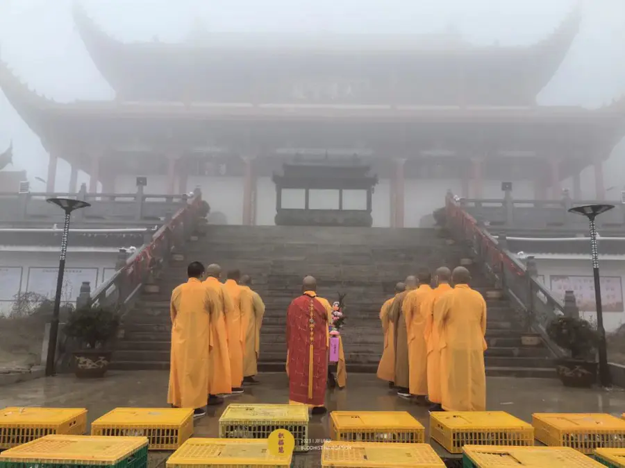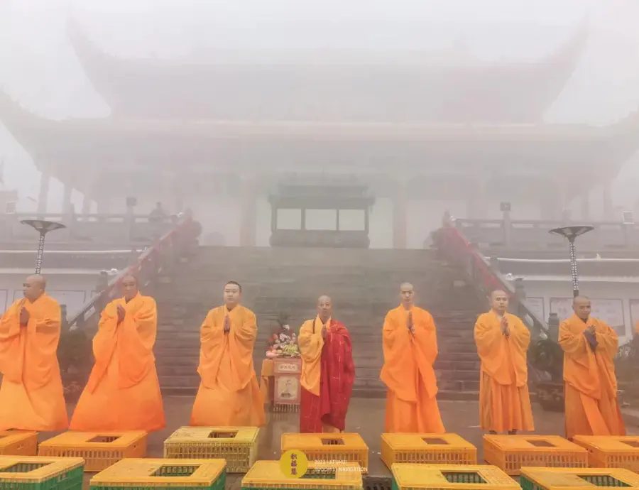 此次放生法会在九华山西来禅寺大雄宝殿外举行