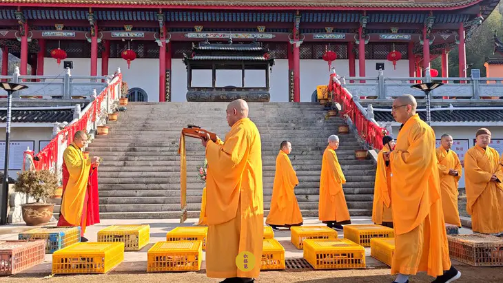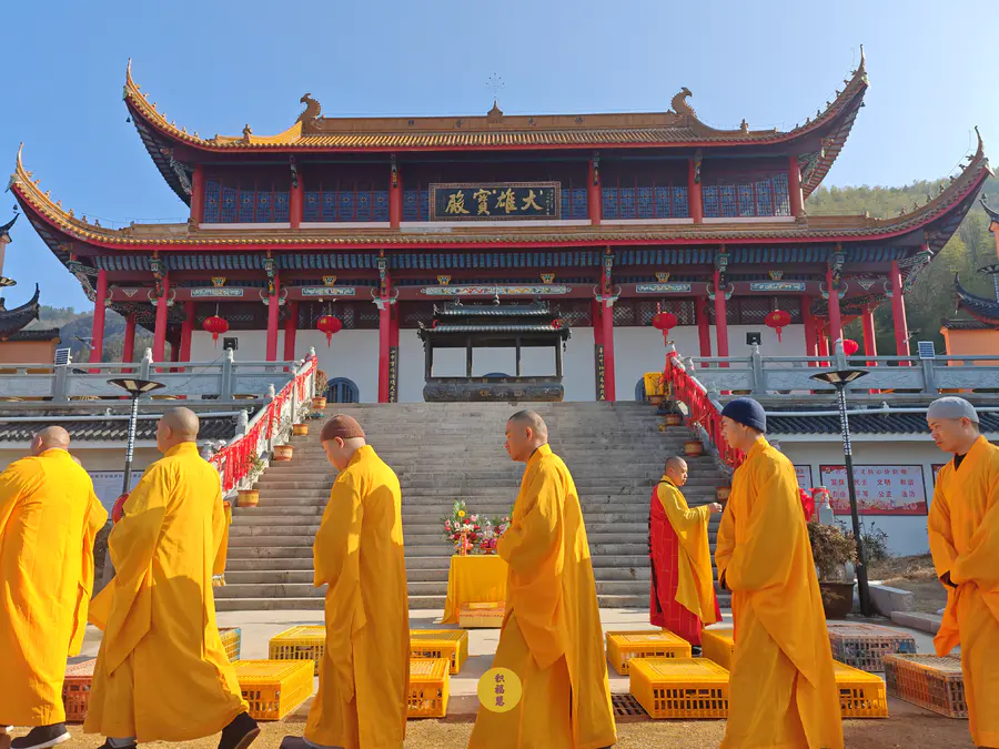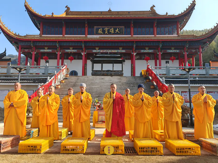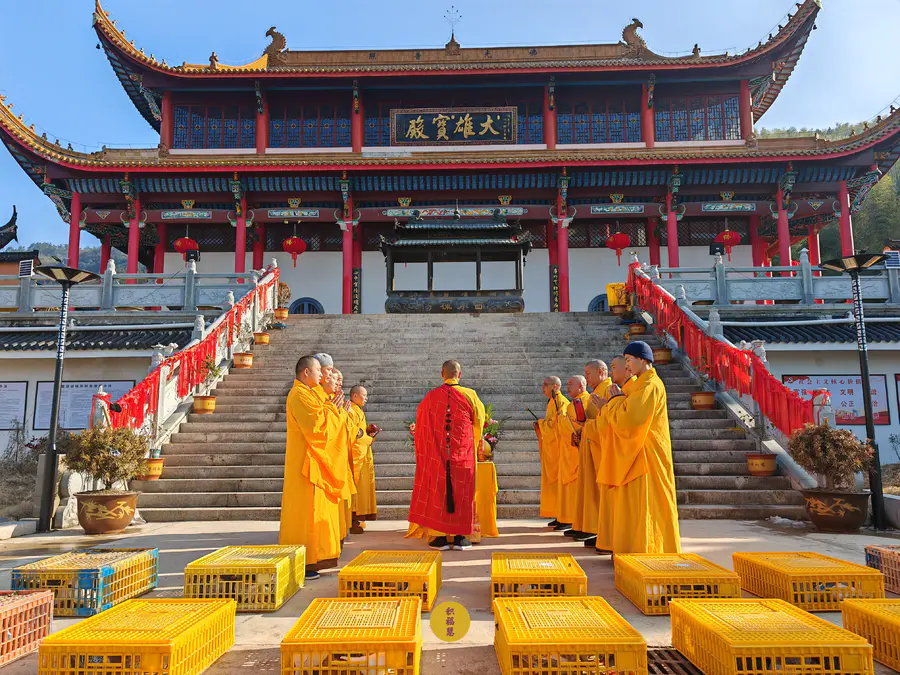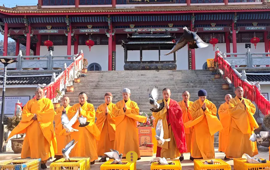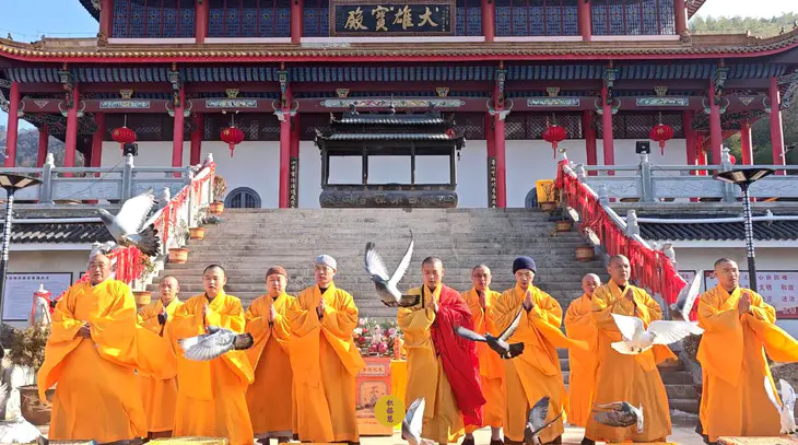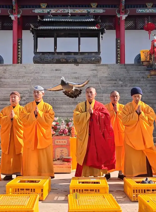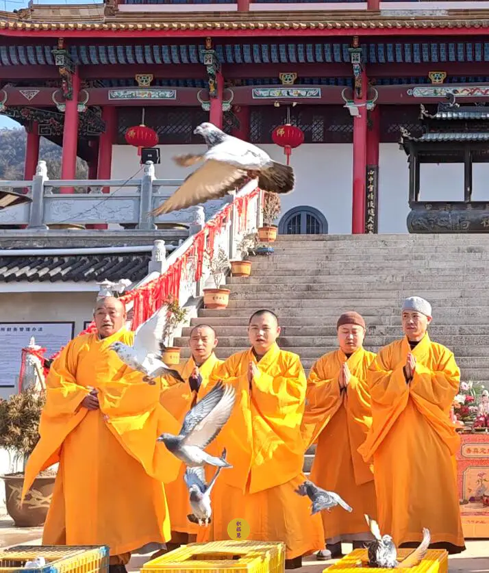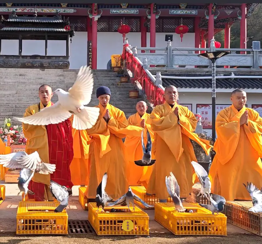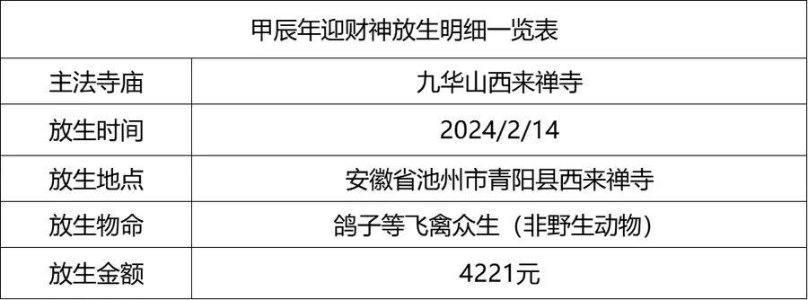 2024年2月14日,甲辰年正月初五,云南安国寺、九华山西来禅寺分别启建迎财神供水法会,如理如法按次第起供,至2024年2月20日供圆满。同日,九华山西来禅寺诸位法师在大雄宝殿前放生鸽子等飞禽众生(非野生动物)金额合计4221元。