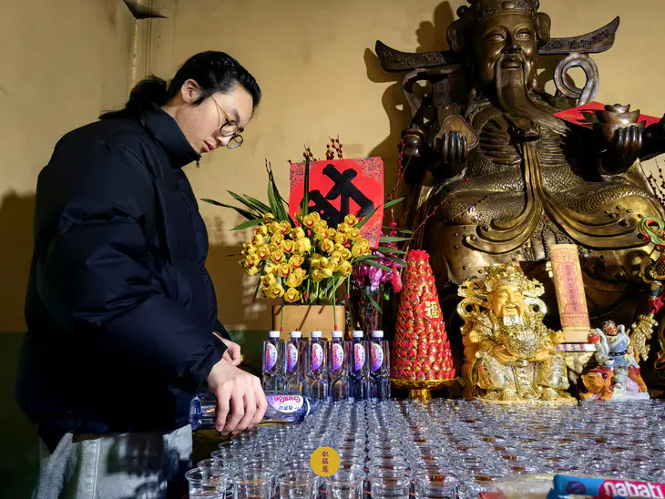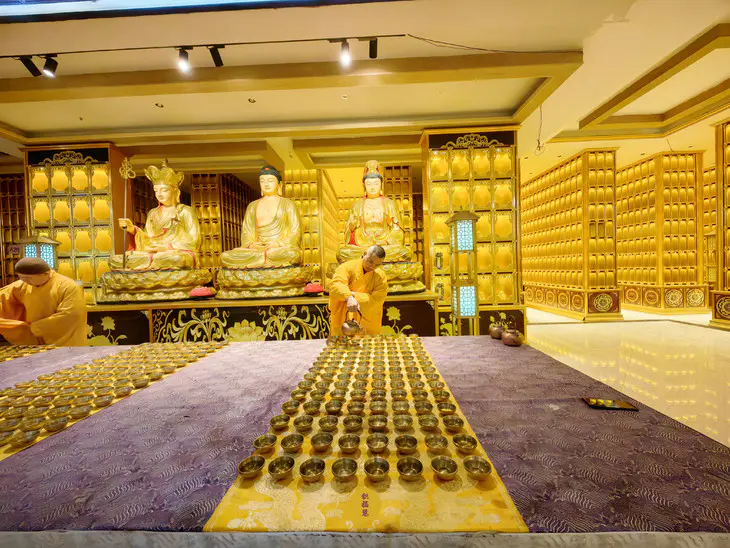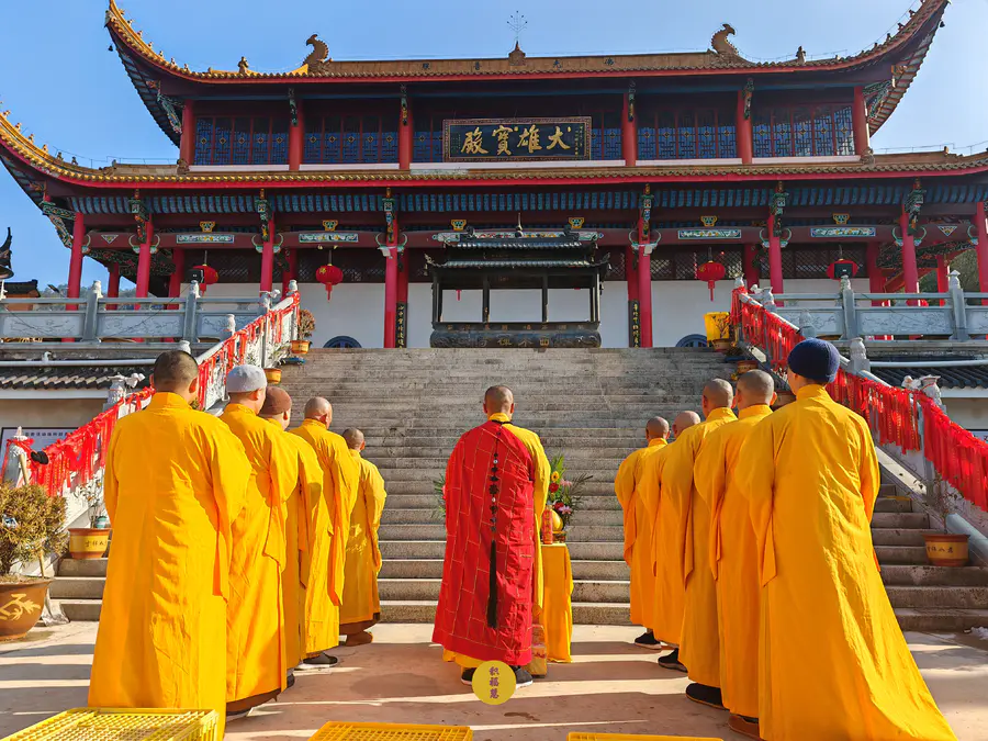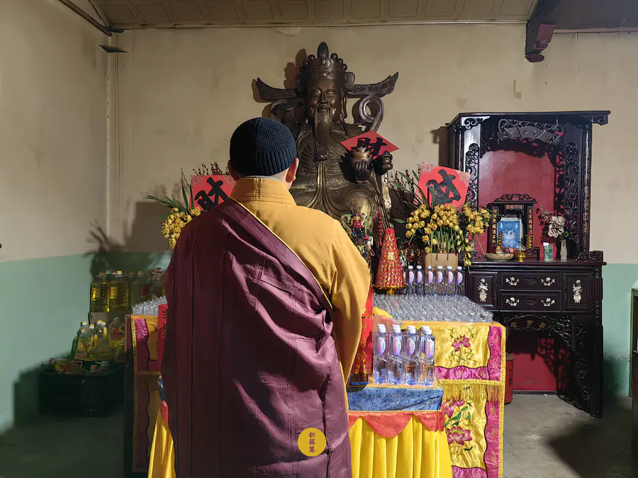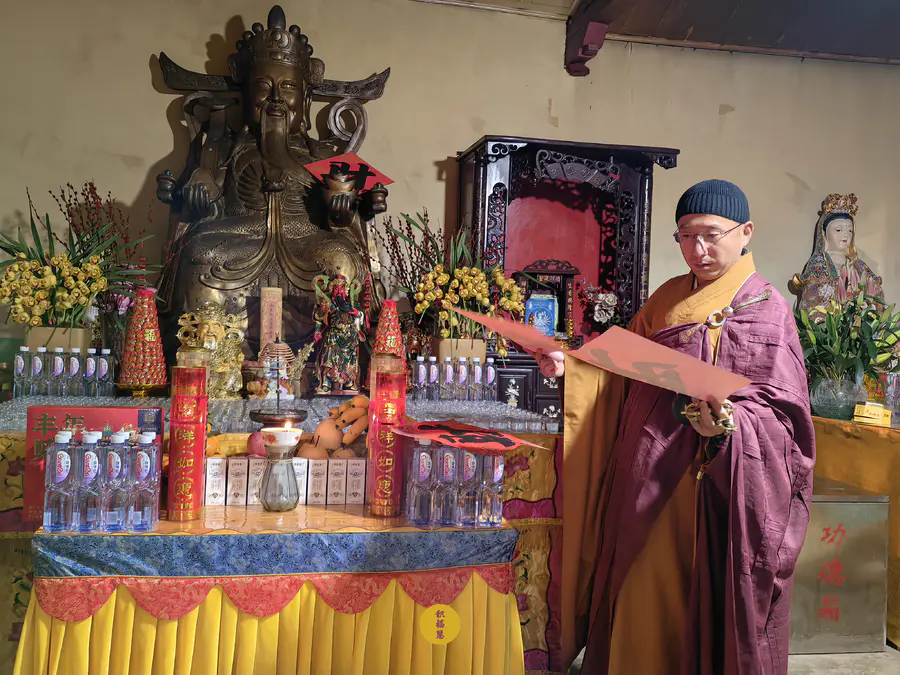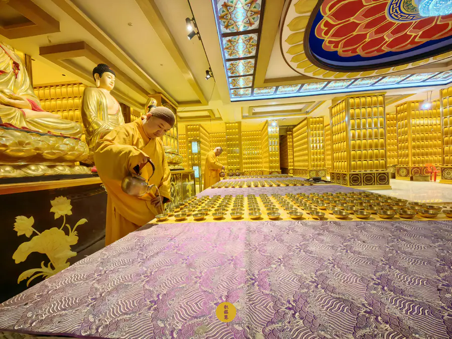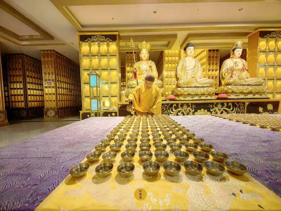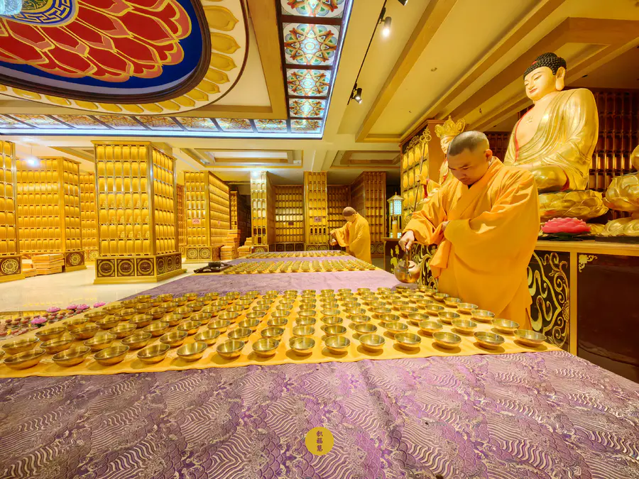 正月初五迎财神日,九华山西来禅寺地藏殿,法师在三世佛前虔心供水,为大众祈福。