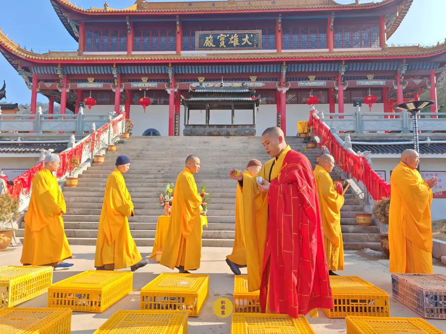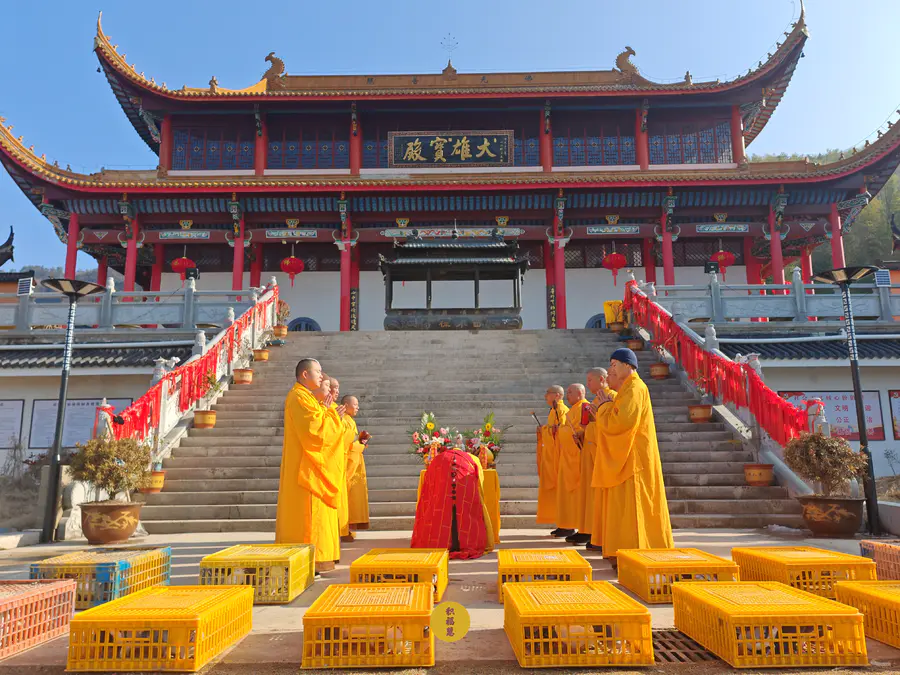 迎财神放生法会在九华山西来禅寺大雄宝殿前举行。