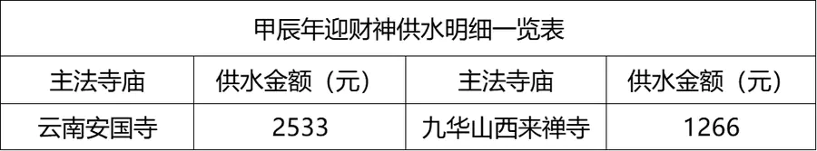 积福慧甲辰年迎财神供水放生共修自2024年2月11日启建,至2024年2月14日24时停止接收功德款,共计4天。同修随喜供水款3799元,放生款4221元。