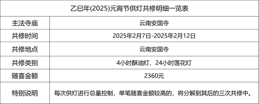 2025年2月12日,乙巳年正月十五,云南安国寺启建元宵节供灯法会,如理如法按次第起供,至2025年2月18日供圆满。