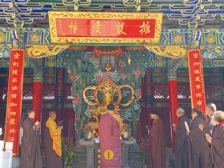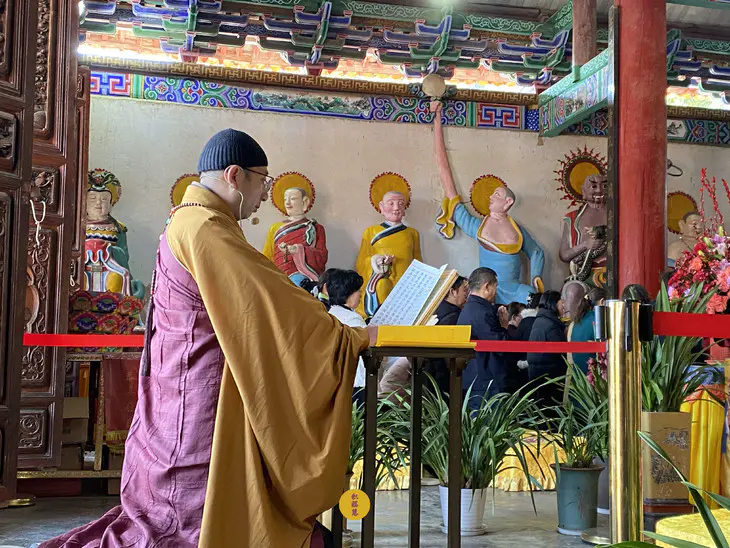 钟鼓齐鸣,佛音袅袅,在梵唱声中,主法法师拈香主法,带领众居士诵经念佛,至诚祈愿佛光加被,龙天护佑。仰祈十方诸佛哀愍覆护,斋主增福,檀那延寿,得如意安康,福泽绵长。