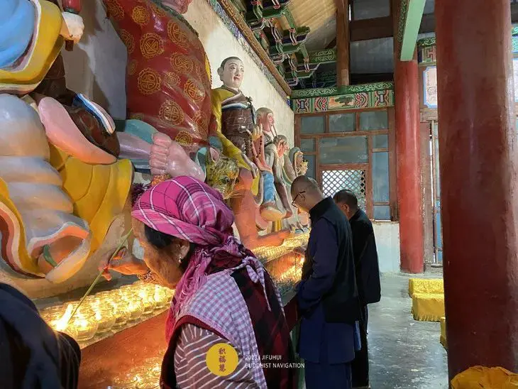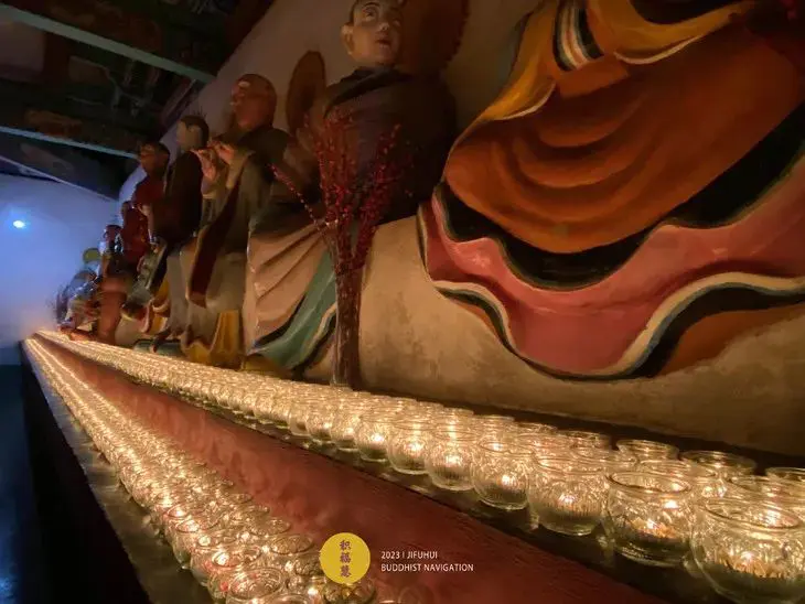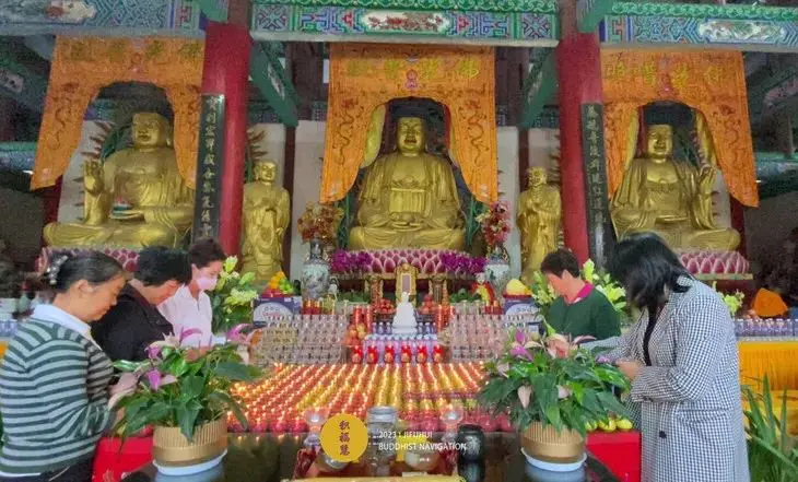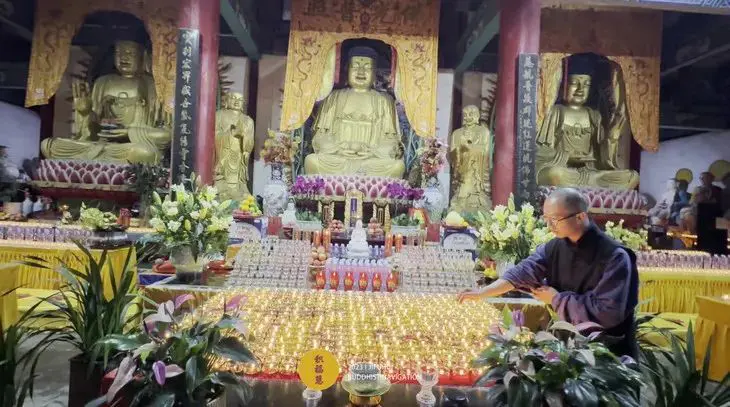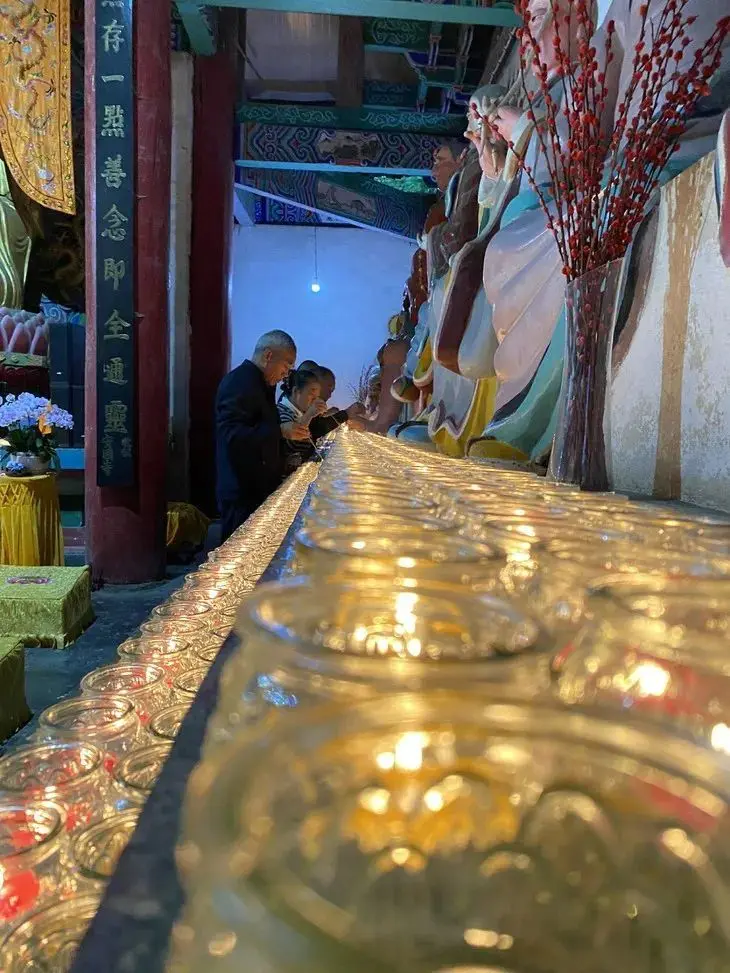 大雄宝殿内,法师义工屏息正意,燃起光明灯。