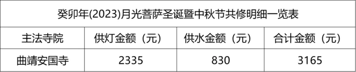 积福慧癸卯年月光菩萨圣诞暨中秋节共修自2023年9月16日启建,至2023年9月29日23时停止接收功德款,共计14天。同修随喜供灯款2335元,供水款830元。