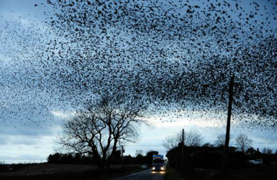 这些鸟儿看起来象在执行“神风”任务,它们的飞行逻辑使得队形妙不可言。每年冬天,星椋鸟会在附近的芦苇荡中觅食,一天活动之后,它们就会飞上天空。结伴飞行在夕阳的余晖中,在领头鸟的带领下快速而聚集飞行。