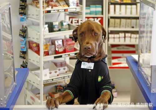 当地时间2009年11月24日,美国佛罗里达州,BP加油站便利店里的小狗Cody在窗口问候顾客,Cody身穿制服,戴着自己的工作证(名片),对顾客非常友好。
