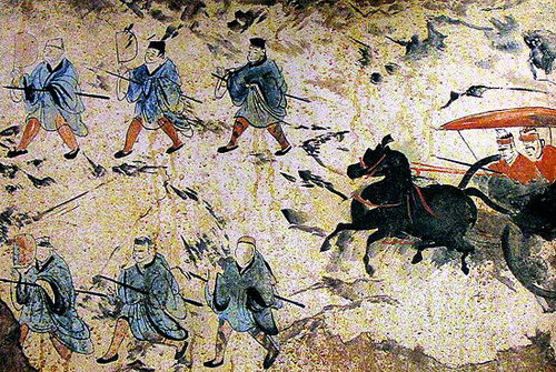 战国时期的彩绘车马人物,图中正在马前奔跑的是两位侍从人员