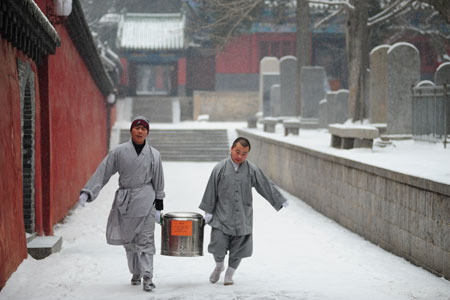 近年来,很多寺庙恢复了腊月初八施粥传统,图为少林寺的僧人将熬好的腊八粥抬往药局