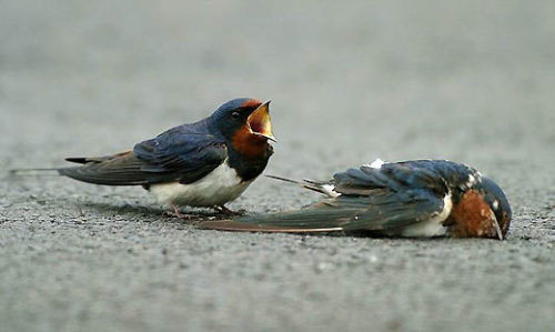鸟儿的感情也是相当丰富的。尽管这只家燕已经在地上不会动了,但是,另一只仿佛是她的家人,马上飞到她的身旁,不忍相信这个实事……
