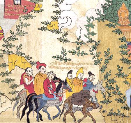 第二类是历史风俗画。画师多采用鸟瞰式的构图方法,把历史故事分成几个片断在一个画面上表现出来。如《文成公主入藏图》(此类画在“唐卡”中较少)。画家在这些历史风俗画中,突破度量经上的局限,将自己所熟悉的社会和人物通过巧妙的构思,以宗教题材的方式反映生活的真实。如通过佛经故事表现古代藏族人民的生活风俗、节日歌舞、藏戏、驰马、竟射、垒墙造屋等,表现了画家独具的艺术匠心。