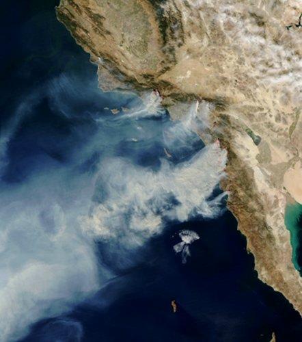 这是美宇航局Aqua卫星于2003年10月27日拍摄到的野火吞噬南加州的照片。照片上的红点是火焰,风借火势,太平洋上空弥漫着烟雾。这次大火肆虐了南加州50万英亩的广大地区,从圣巴巴拉郡到美墨边境地区,无一幸免。