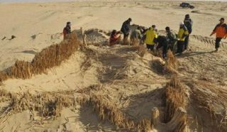 2001年6月,国家开始斥巨资实施塔里木河综合治理工程,通过对塔里木河的工程治理和流域水资源的统一调度,增加了塔里木河水的来水量,水流曾重新回归台特玛湖,形成200平方公里湖面。在台特玛湖边,塔里木河流域管理局立碑设亭,以便“观水”。不过,考察队未能在“观水亭”一睹碧波荡漾的情形。2日16时许,沙尘天气突起,漫天黄沙遮住了视线,连明晃晃的太阳都变成黄灿灿的“月亮”。