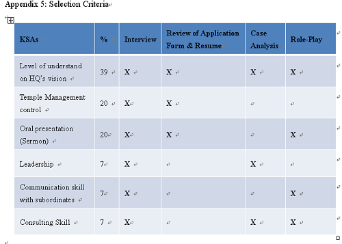 Before the applicants become candidates, HR department will do a series of review on applicant’s application and resume. For the job description, it clearly point out that a supervisor should have some level of understanding to headquarters’ (HQ) vision, a certain degree of temple management skills, capable of deliver a sermon, know to lead, communicate and help subordinates. Thus these knowledge, skills, and ability (KSAs) are act as measurement for choice eligible candidates (See Appendix 5). As mention previously, understand HQ’s vision is vital which includes the level of understanding to the 12 rules mentioned by the founder. Other skills are learnable such like temple management could be learned from experience, sermon delivery could be improved by repetitions, and leadership and communication skills could also learn from experiences. Therefore, the weightage for understanding HQ’s vision is 39. The ability of temple control is decisive for temple’s prosperity as well as the level of sermon delivery; hence there are 20 percent of weightage for each criterion. The rest of measurement criteria weight 7 percent each as they are equality important. By reviewing application and resumes could waive out most of unqualified applicants which shorten recruitment and selection period. However, there are issues such as resume fraud (Debats, 1981), the accuracy for application screening (Whitener, 1990), as well as limited information shown on application form.