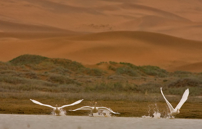 寻着给我们带路的牧人的摩托车印,我们向更深的大漠进发。在一个美好名词——沙漠冲浪的浪漫中,我的五脏也在翻江倒海。据说沙漠深处50多公里的地方有一个真正的天鹅湖,那里有几百只的白天鹅,带着对天鹅的向往,我什么都不在乎了。我们冲上了一个又一个沙峰,越过了一个又一个锅底坑。车子的发动机出现故障了,一半的男人们都围在车前帮忙修理。剩下的就是不懂车的人和女人了,我心里其实是有点开心的,毕竟可以下来透透气,可以暂时不用再忍受晕车的痛苦。修车的人中好长时间都没有谁说笑了,原来车的毛病比较严重。终于修好了,幸亏车主是个经验丰富的老司机,不然的话,我们将会困在沙漠里等待援助了。在车子沉重的呻吟中,我们又冲进了沙海,继续往大漠更深处进发。路过的每个湖泊边都能看见被惊飞起来的鸟。其中一个大约长四公里的盐碱地里三三两两的赤麻鸭不时惊叫着飞走,只要放眼看去,泞泥的沼泽地上停落的全是橘黄色的麻鸭,我们全部惊叹不已,原来这里还有这么多的鸭子居住着。接近盐碱地中间的时候,忽然眼前一小群灰鹤警惕地伸长脖子,远处的水里密密麻麻的都是鸭子的影子。我惊叫停车,拿着相机就冲下车。鸟对陌生人非常警惕,没有等我往前走就飞起来了。大群的鸭子也一批一批地不断起飞盘旋在空中。没有拍到近距离的鸭子,也看不清都是什么鸭子,只看见大约几千只的鸭子飞起又落下的宏伟场面,非常的震撼,从来都没有见过这么多的鸭子在一起。顿时觉得这个死一般寂静的沙海无限美丽,生机昂然。