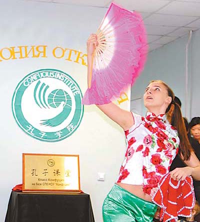 俄罗斯圣彼得堡孔子课堂的学生在表演中国扇舞