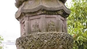 走近一看,记者发现石塔八面雕刻着形态各异的佛像,并伴有莲座、祥云等浮雕。而石塔的底层大部分掩埋在泥土之中,因塔身整体倾斜,底层与基座间有着巨大的缝隙。