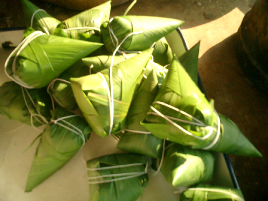 据记载,早在春秋时期,用菰叶(茭白叶)包黍米成牛角状,称“角黍”;用竹筒装米密封烤熟,称“筒粽”。东汉末年,以草木灰水浸泡黍米,因水中含碱,用菰叶包黍米成四角形,煮熟,成为广东碱水粽。