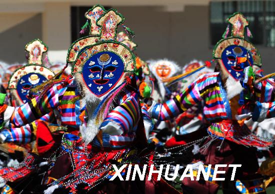 藏戏的演出,一般是广场戏,少数也有舞台演出形式。演出时,化妆比较简单,除戴面具外,其他就是一般的粉面与红脂,没有复杂的脸谱。