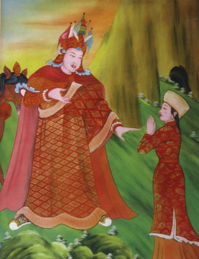 《格萨尔王传》讲述了这样一个故事:在很久很久以前,天灾人祸遍及藏区,妖魔鬼怪横行,黎民百姓遭受荼毒。大慈大悲的观世音菩萨为了普渡众生出苦海,向阿弥陀佛请求派夭神之子下凡降魔。神子推巴噶瓦发愿到藏区,做黑头发藏人的君王——即格萨尔王。为了让格萨尔能够完成降妖伏魔、抑强扶弱、造福百姓的神圣使命,史诗的作者们赋予他特殊的品格和非凡的才能,把他塑造成神、龙、念(藏族原始宗教里的一种厉神)三者合一的半人半神的英雄。格萨尔降临人间后,多次遭到陷害,但由于他本身的力量和诸天神的保护,不仅未遭毒手,反而将害人的妖魔和鬼怪杀死。