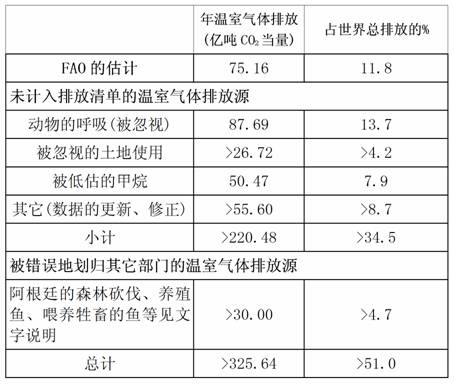 报告列出的被忽略和低估的牲畜温室气体排放源(见下表)有:动物的呼吸、土地使用和甲烷。