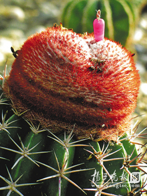 翠云、层云、郝云,这些动听的名字都是仙人掌科花座属植物的名字,它们是哥伦布发现新大陆后,最早带回来的一种植物。记者看到,长满刺的绿色“球体”戴着一顶红黑两色相间的“帽子”,远远望去,仿佛一片彩云。“红色的是花座。”耿蕾介绍说,它们要十年以上才长出花座并开花,花座中间镶嵌着一圈圈的黑色是它的年轮。更奇特的是,有的花座上还有一两只灯笼状的果实,呈紫红色。