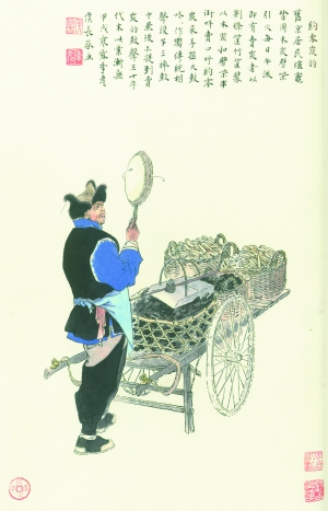 早先北京居民生炉灶都用木炭和劈柴引火,每日午后就有卖炭的,以荆条筐或竹筐装上木炭和劈柴串巷叫卖,吆喝“约零炭呐”,手摇一面扁鼓,咕咚作响。传统相声段子《三梆鼓》最后也提到卖炭的鼓声。上世纪三十年代末,这种行业就没有了。