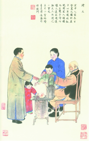 京城人家,冬日都是置火炉于屋中,既能取暖,又能做饭。晚间一家人围着炉,或坐或立,双手伸向炉火,边取暖边聊天,其乐融融。