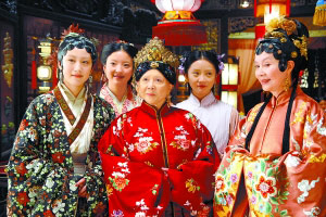 曾备受质疑的“铜钱头”,在融于剧中场景再看时,黛玉、宝钗以这样发型出现,并不十分别扭。不过,贾母、王夫人、薛姨妈这样的中老年妇女也顶着一头铜钱还是让人感觉不太好,少了贵族妇女应有的雍容华贵之气。