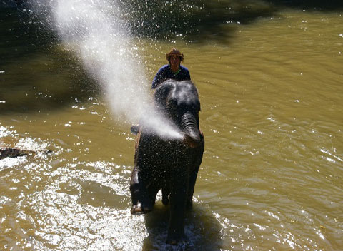 60岁老象与58岁赶象人水中嬉戏