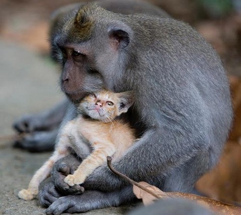 印尼短尾猴收养流浪猫当孩子 相依为命