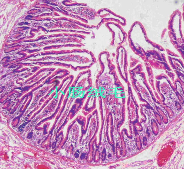 小肠腔内粘膜面与食物接触的皱襞放大可以看到是由大量密集的绒毛组成。
