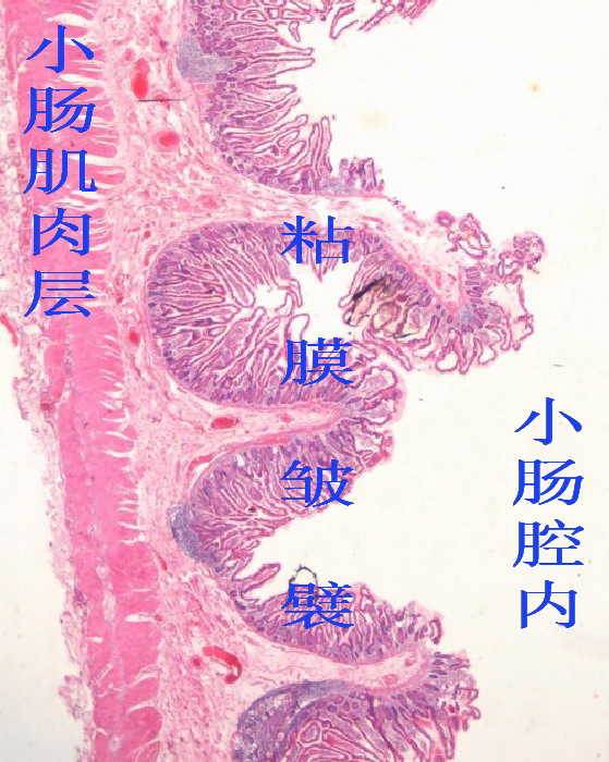 先看看人类小肠。整个肠管是食物吸收的主要部位。管腔内层不是平的,看上去是一条条紧密排列的弯弯的粘膜皱襞。