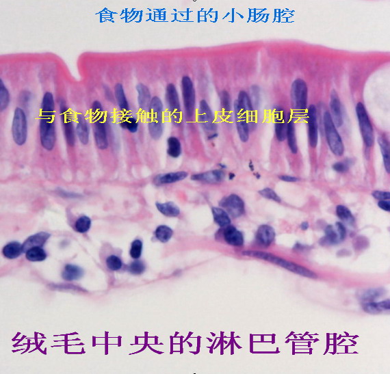 图9 从上往下为肠腔、上皮细胞、基底膜、间质,最下为淋巴管管腔