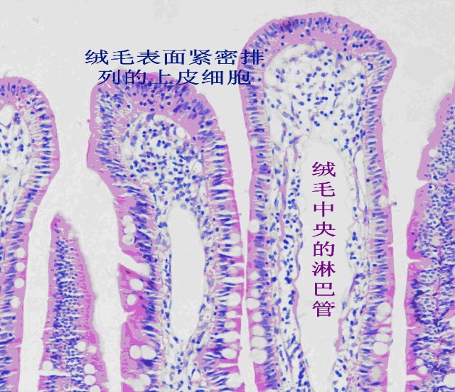 每一根绒毛由外周一层上皮细胞,中心是淋巴管组成(图8),上皮细胞表面还有微绒毛。