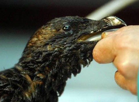 这是一幅令人触目惊心的画面——一只遍体油污的海鸥被冲到海滩上,双眼凄迷、双翅抖动,拼命挣扎着想抬起头看一眼蓝天,但没有成功,这只战胜惊涛、战胜恶浪的鸟儿终于没有抵挡住浓黑的石油的侵袭。