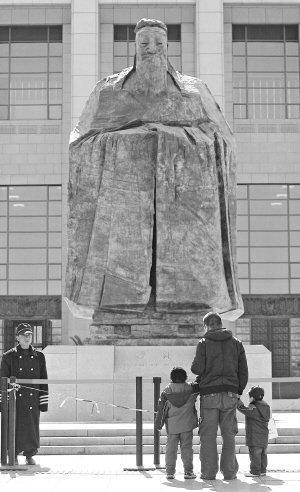 一位来自乌鲁木齐的家长带着他的儿子和侄儿,来到北京天安门广场东侧的中国国家博物馆(微博)北门广场,观看今年1月落成的孔子塑像。