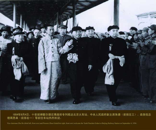 1954年9月4日,出席全国人民代表大会会议的西藏地区代表达赖喇嘛和班禅额尔德尼·确吉坚赞到达北京。中央人民政府副主席刘少奇、国务院总理周恩来、中国佛教协会代会长喜饶嘉措和北京市僧尼、喇嘛代表等八百余人到车站迎接。