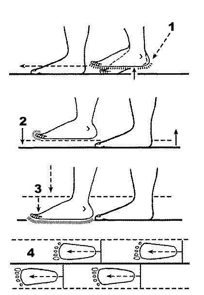 2‧脚掌移前时,脚跟在下。