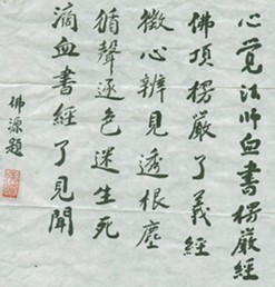 玉成老人幼年读书不多,而一生好学不倦。中年以後,能诗善文,书法亦可观。会弹七弦琴,弹得极为精妙,但以无知音故,轻易不弹。老人还有一项人所不及之处,是他尊重知识,礼遇读书人。在南亭法师悼念老人的文章中,有一段有趣的小故事,可见一斑∶