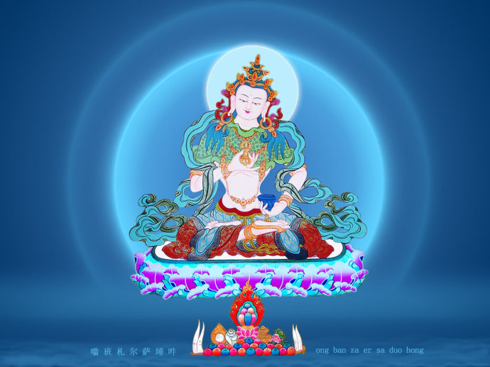 刚才说的是忏悔的重要性。关于忏悔的方式,你们有些可能不懂。怎么样忏悔呢?进行忏悔的最好的本尊就是金刚萨埵。金刚萨埵佛像,我们这个法本当中也有,如果你们有一些密宗等净无二的境界的话,就用双运像的金刚萨埵本尊像也可以。但是如果在这方面没有什么清净心或者密宗的一些深的见解,那么就只观想一个单身的金刚萨埵在自己的前面,然后在金刚萨埵面前一直忏悔。自己心里面观想金刚萨埵,或者把照片放在前面,对自己无始以来所造的这些罪业一边念“嗡班匝萨埵吽”,一边忏悔。忏悔完了,马上要回向的时候,观想金刚萨埵的身体发光,然后降下甘露,自己身体当中所有无始以来所造的业,全部都已经得以清净。
