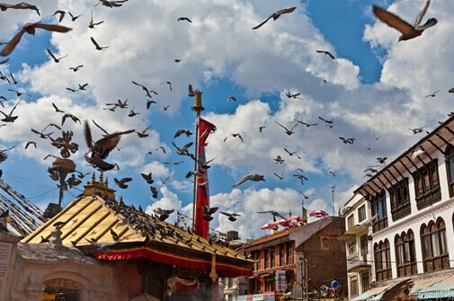 尼泊尔首都加德满都在《大唐西域记》中描述为:城外高山延绵不绝佳木葱茏,更有一种奇特的“比命鸟”,两头一身。在佛经里,比命鸟是由佛陀化现出来的飞禽,它潇洒地飞行在净土中,日夜不停地向大众演唱五根、五力、七菩提分法的佛教教义,使得进入净土的菩萨闻法悟道。